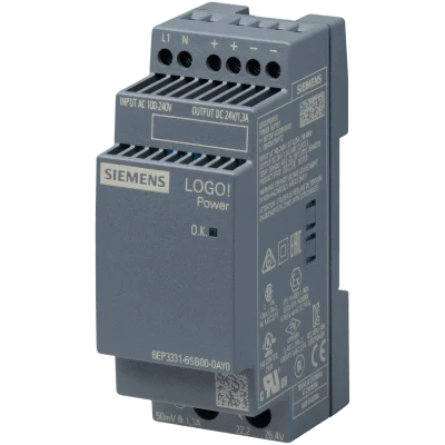 La fuente de alimentación estabilizada LOGO!POWER de Siemens proporciona una tensión continua regulada de 24 VDC con una corriente nominal de 1.3 A. Diseñada para aplicaciones industriales, cuenta con entrada universal de 100-240 V AC/DC y rango de ajuste de salida de 22.2 a 26.4 V mediante potenciómetro. Ofrece alta eficiencia del 86%, protección contra cortocircuitos y sobretensiones, y cumple con los estándares de seguridad EN 60950-1. Su diseño compacto permite montaje en rail DIN EN 60715 35x7.5/15 o montaje directo en pared, siendo ideal para automatización y control industrial.