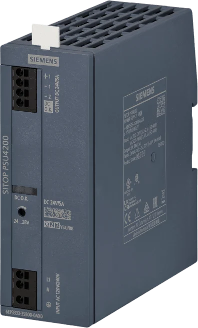 La fuente de alimentación industrial SITOP PSU4200 es una unidad estabilizada de 24 V DC con capacidad de 5 A diseñada para aplicaciones profesionales en automatización industrial. Ofrece entrada monofásica de CA con rango automático de selección 100-120V/200-240V y proporciona una tensión de salida ajustable entre 24-28V mediante potenciómetro. Cuenta con protección contra cortocircuitos, sobretensión y incluye señalización mediante LED verde para operación normal. Su construcción robusta con clase de protección IP20 y montaje en riel DIN EN 60715 la hace ideal para entornos industriales exigentes. La unidad presenta alta eficiencia del 87% y cumple con las normativas internacionales CE, UL, UKCA y EAC.