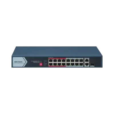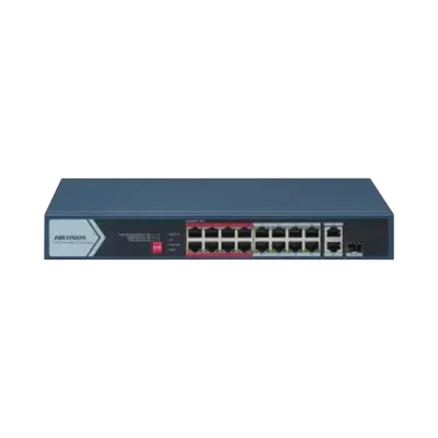 Switch PoE+ / No Administrable / 16 Puertos 10/100 Mbps PoE+ / 2 Puertos 1000 Mbps Uplink / 1 Puerto SFP Uplink / Modo Extendido hasta 300 Metros / 130 W