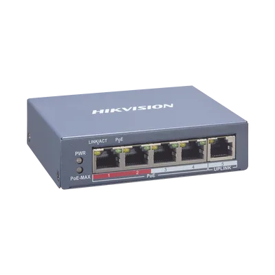 Switch Monitoreable PoE+ / 4 puertos 100 Mbps PoE+ / 1 Puerto 100 Mbps Uplink / PoE hasta 250 Metros / 60 Watts / Conexión Remota desde Hik-PartnerPro