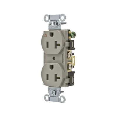 Contacto dúplex, grado comercial, 2 polos, 3 cables, 20A 125V, NEMA 5-20R, color gris.