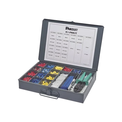 El kit de mantenimiento industrial K1-PNKIT tiene compartimentos individuales para almacenar terminales Panduit. El kit incluye una amplia variedad de terminales, bridas, terminales de desconexión y empalmes Panduit. Una vez que la parte superior se cierra, los productos quedan organizados y permanecen en sus compartimentos.