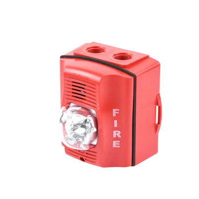 Sirena con Lámpara Estroboscópica / para Exterior / a 2 Hilos / Montaje en Pared / 12 o 24 Vcd / Configuración Estroboscópica Seleccionable / Texto en Inglés / Incluye Caja de Montaje / Color Rojo