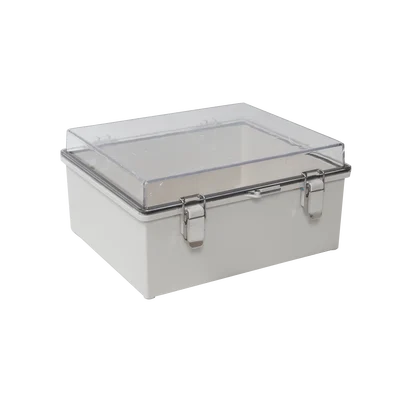 Gabinete Plástico ABS, Puerta Transparente, Uso en Intemperie (300 x 300 x 180 mm) Cierre por Broches Inoxidables y Permite Cerrado con Candado y Llave (Perno 5mm) No Incluido
