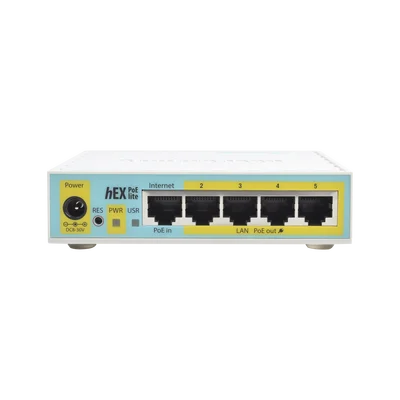 hEX PoE Lite es un pequeño router de Ethernet de cinco puertos en una caja de plástico, que tiene un puerto USB 2.0 y salida PoE.