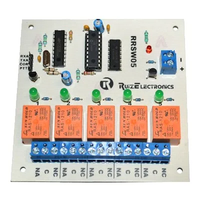 Tarjeta decodificadora de 5 zonas con salidas de relevador internos para 500 W. Cuenta con acuse de recibo para indicar que la tarjeta realizó la acción correcta de encendido o apagado de los equipos conectados. Es la forma más económica de controlar remotamente algún motor, sirena, estrobo, alarma, puerta, barrera vehicular, calefacción, refrigeración, alumbrado, repetidor, etc.
