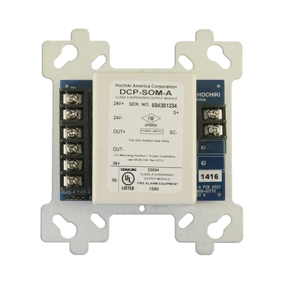 Los módulos de salida supervisados de clase A (DCP-SOM-A y SOM-AI) se han diseñado para proporcionar flexibilidad de aplicación y respuesta rápida a las condiciones de emergencia. La flexibilidad se proporciona por una amplia gama de modos de funcionamiento, que incluyen operaciones multizona, y/o funciones, hasta 16 patrones de modulación diferentes y programación multiestado. Los parámetros de funcionamiento para DCP-SOM-A y -AI son mantenidos por el módulo y no requieren la comunicación individual con el sistema de control durante las condiciones de emergencia para operar.