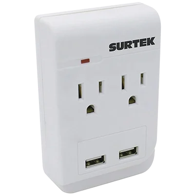 - Convierte una conexión de pared en dos salidas de corriente alterna además de dos puertos USB
